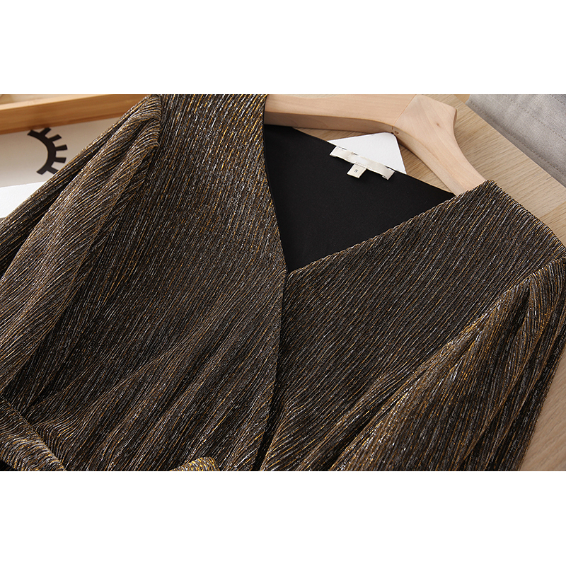 舒适精致优雅有女人味 对襟V领松紧腰亮丝泡泡中袖腰带 女连衣裙