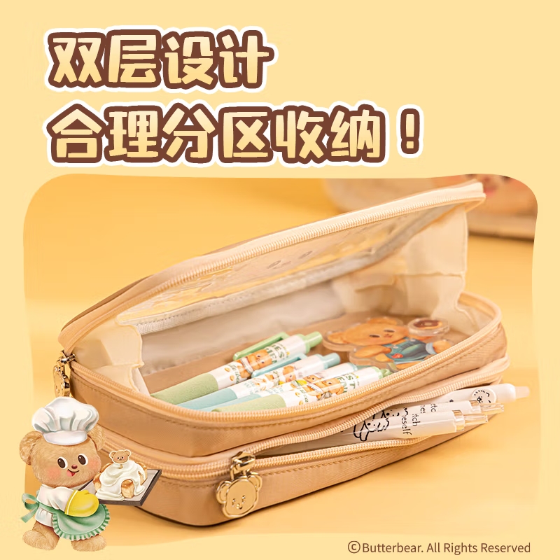 得力HY703黄油小熊联名双层痛笔袋中小学生卡通可爱多功能铅笔盒