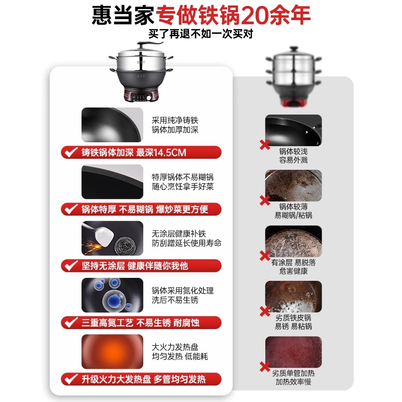 惠当家多功能电炒锅正品家用炒菜大功率无涂层铸铁蒸煮炖火锅一体
