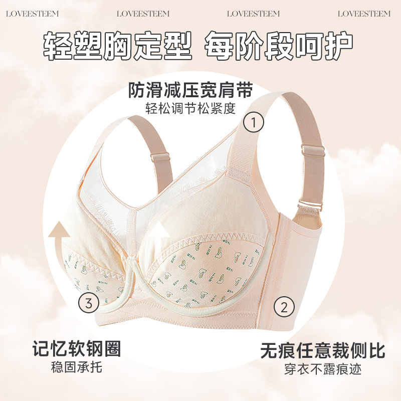 大胸显小夏季透气薄款内衣女记忆软钢圈上托调整防下垂收副乳文胸