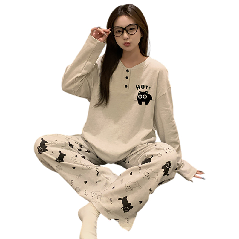 2025新款纯棉睡衣女春秋季长袖长裤套装卡通可爱猫咪家居服可外穿
