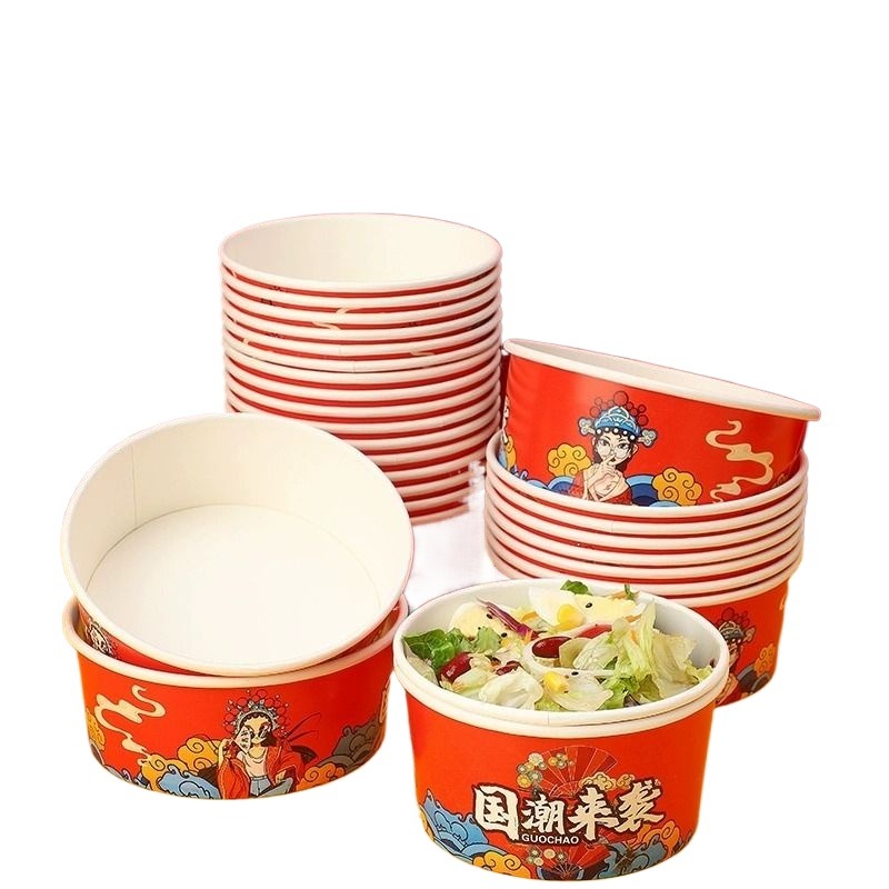一次性纸碗圆形加厚国潮餐盒沙拉碗外卖打包盒带盖100只饭盒卫生