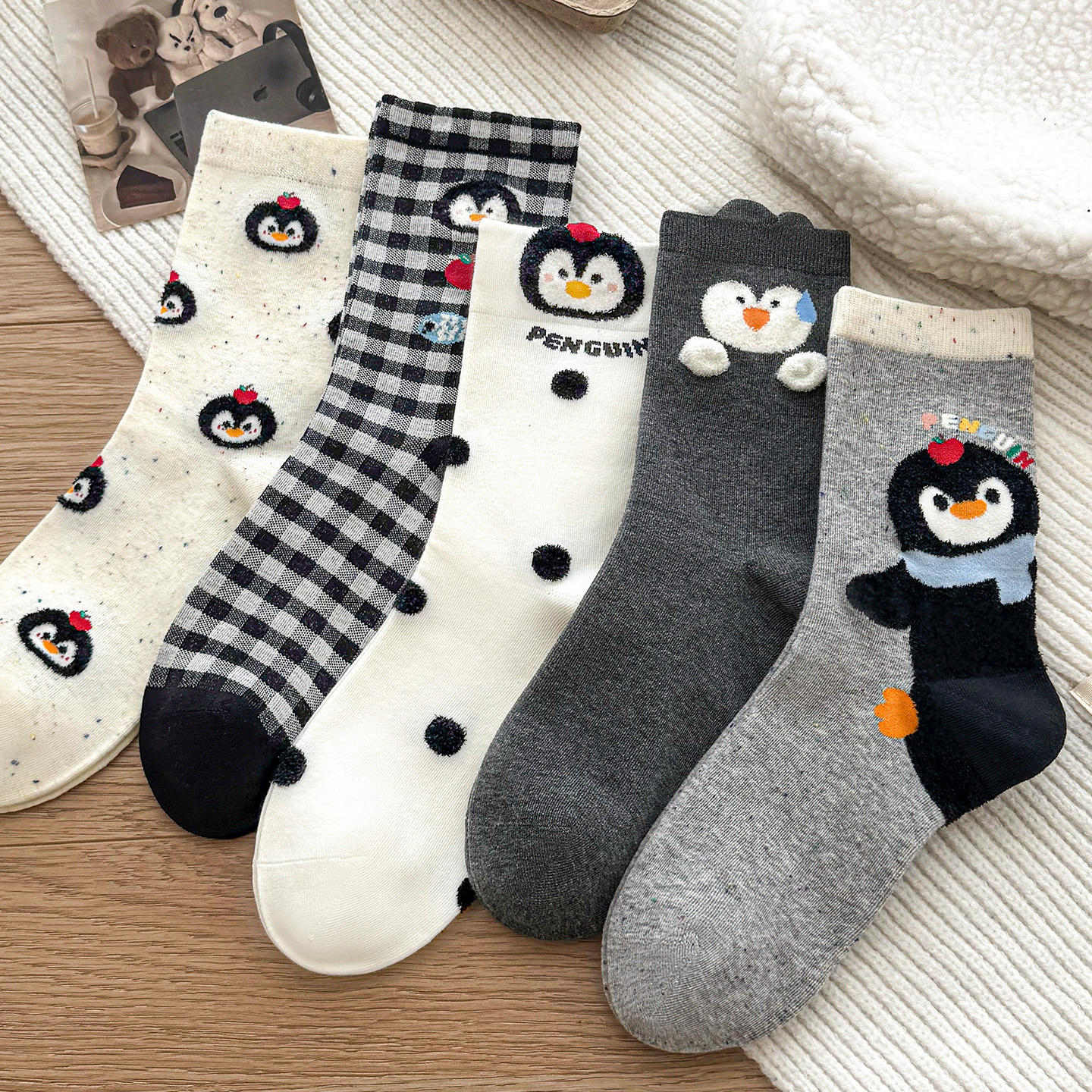 卡拉美拉2025秋冬新款棉袜女士中筒袜子可爱企鹅透气吸汗搭配女袜