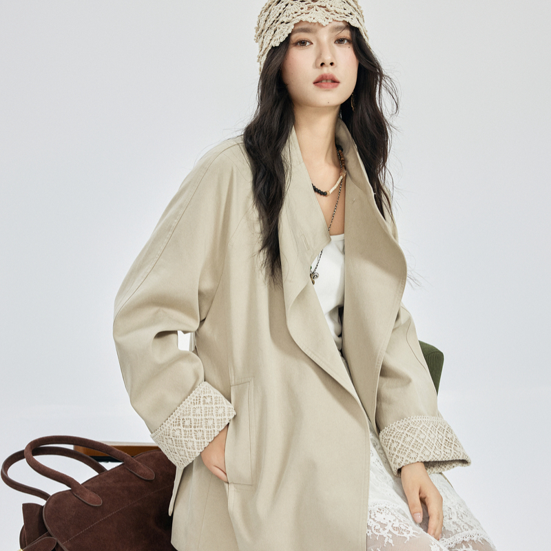 范洛 拼皮风衣女2025春新款高级感翻领拼接宽松显瘦气质短款外套