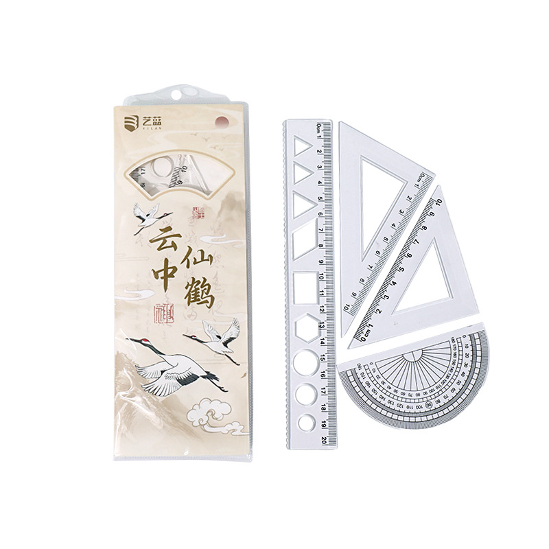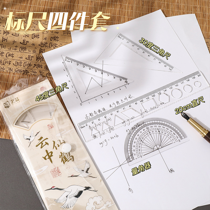 学生初中尺子套装复古中国风儿童直尺三角板量角器四件套透明套尺