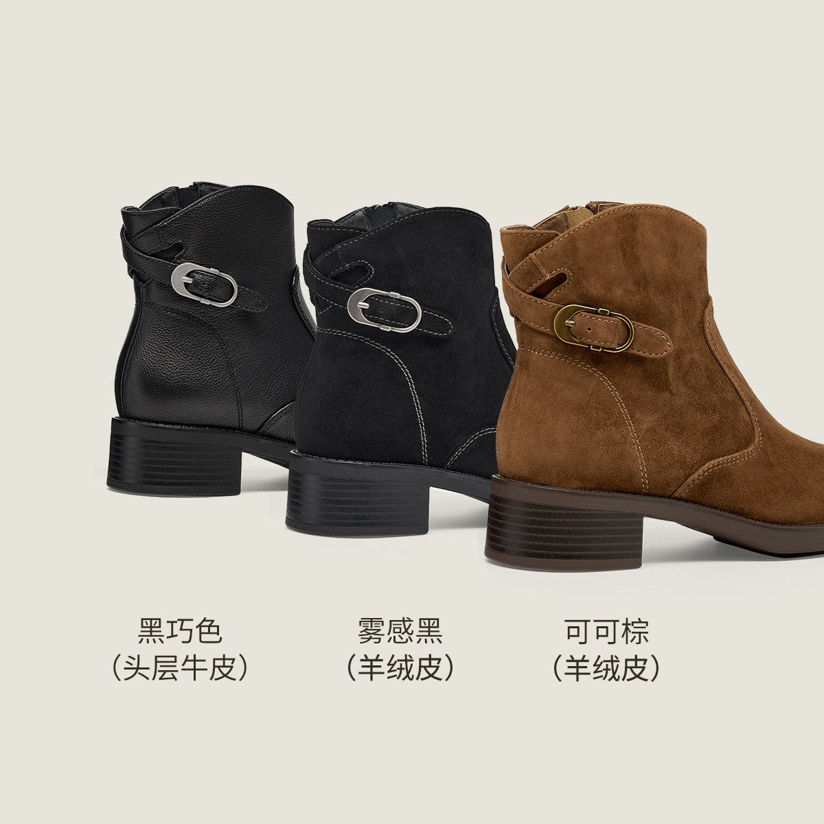 真皮~内增高短靴女2025年秋季新款美拉德复古粗跟堆堆西部牛仔靴