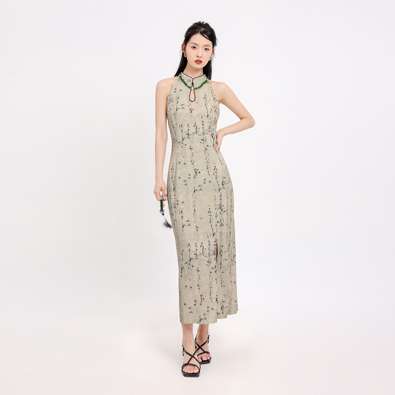 记忆的起点连衣裙2024夏季新款无袖挂脖气质收腰长裙子68AX82755H