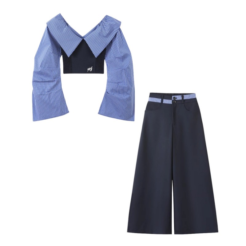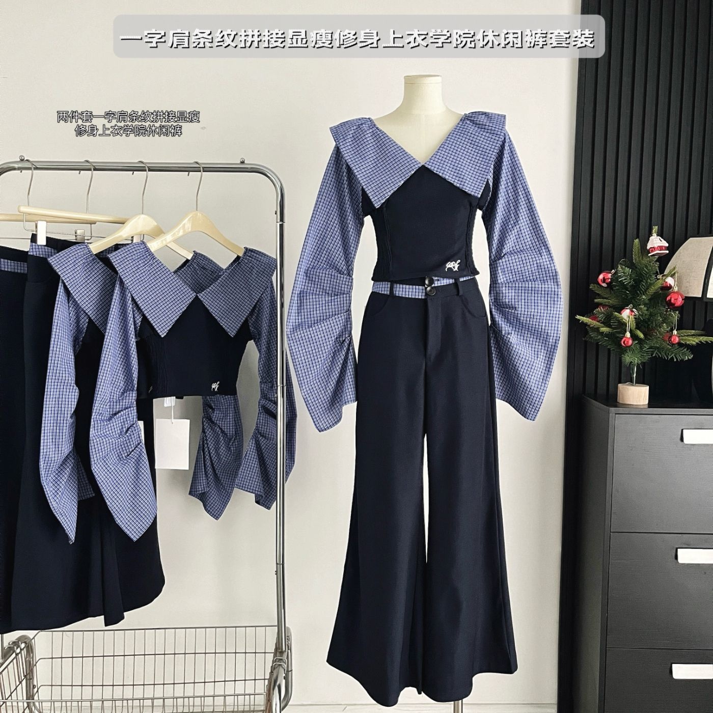 春季套装御姐辣妹风V领衬衫大码一字肩上衣高腰休闲阔腿裤两件套