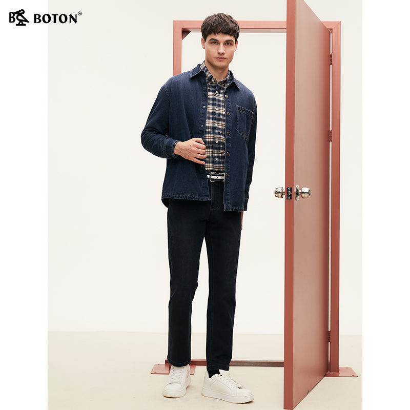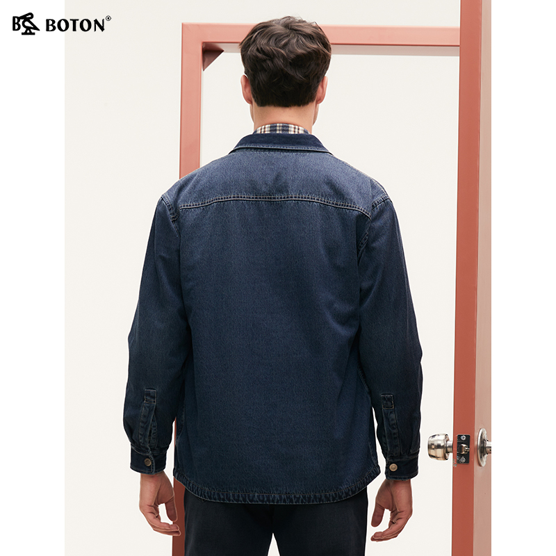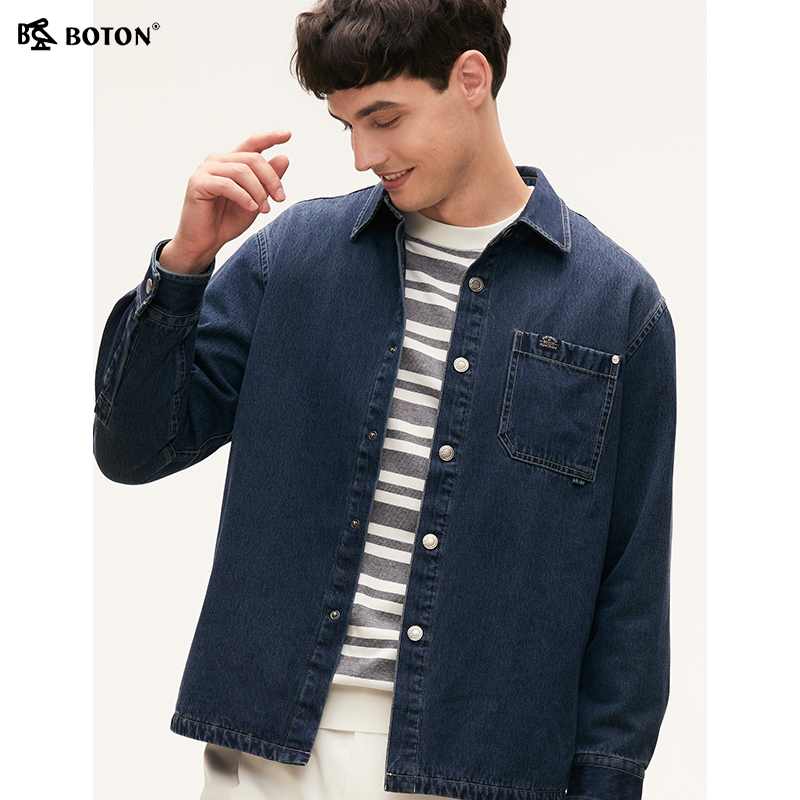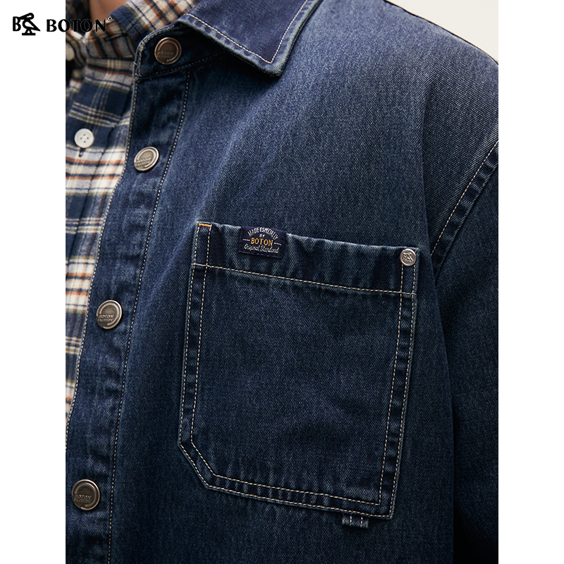 波顿2025秋季新款男士深蓝色长袖牛仔口袋衬衫高端美式休闲衬衣
