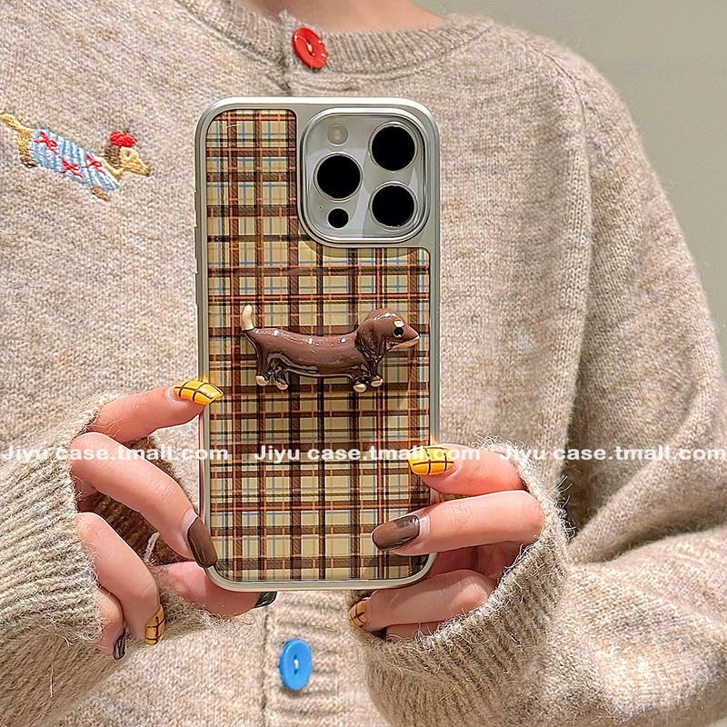 秋冬复古撞色格纹立体腊肠狗适用苹果16promax手机壳iPhone15新款14pm电镀13卡通16pro小众女15pro创意16全包