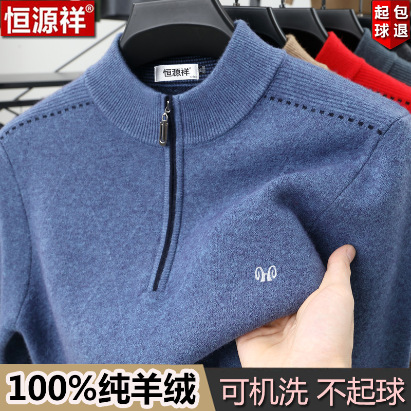 恒源祥羊绒衫男半高领拉链毛衣男款冬季加厚保暖中老年羊毛针织衫