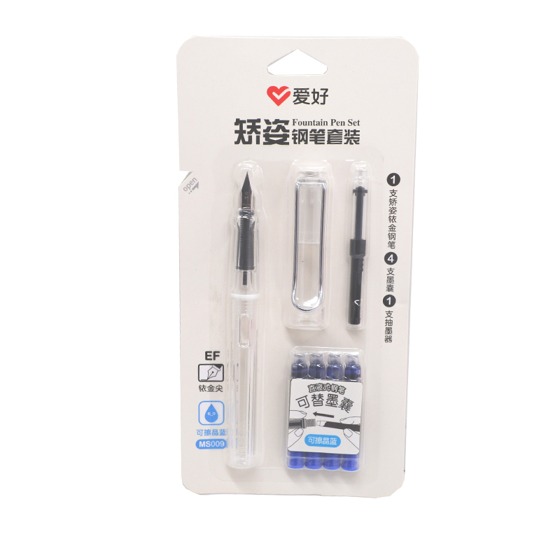 爱好009 矫姿钢笔套装 钛金可擦晶蓝墨囊透明学生钢笔配抽墨器