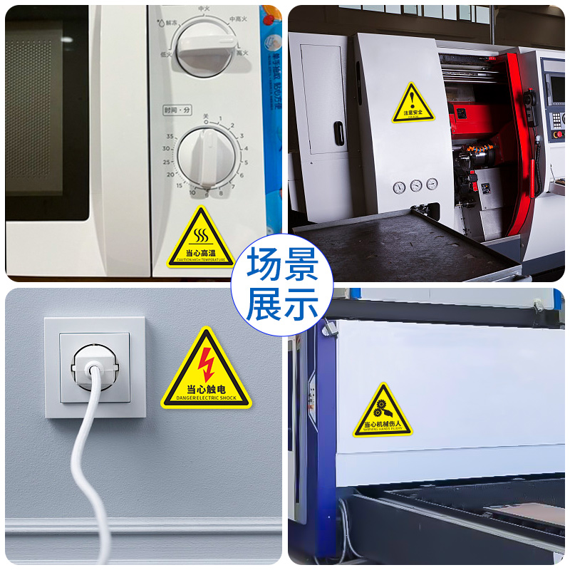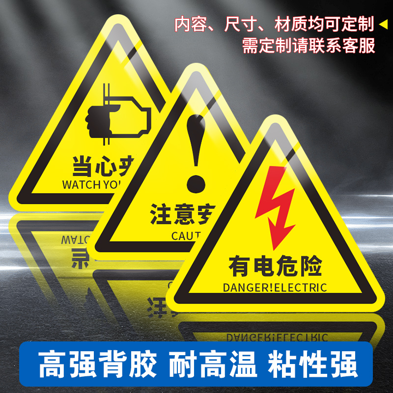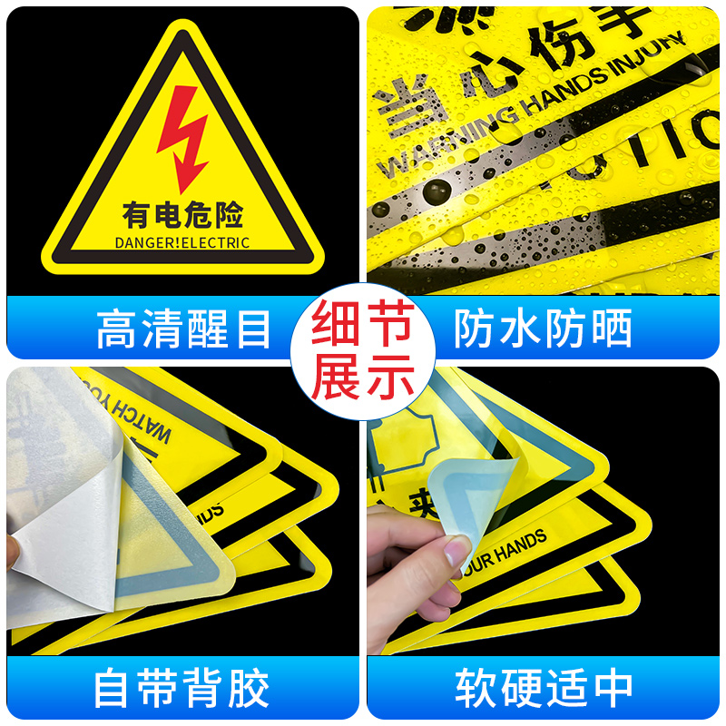 有电危险 当心触电高温伤手机械伤人夹手注意安全警示贴 PVC三角形车间车床剪板机配电箱标示贴指示牌定制