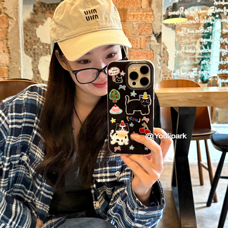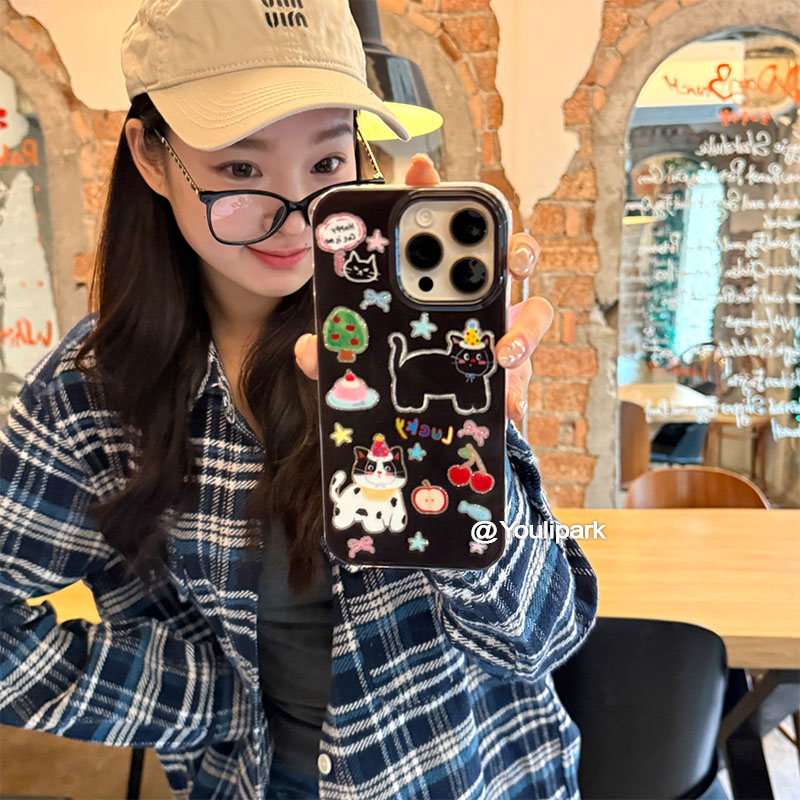 由里公园ins可爱闪粉涂鸦星星樱桃猫咪15适用17pro苹果17ProMax手机壳iPhone16全包17韩系14Promax保护套13女