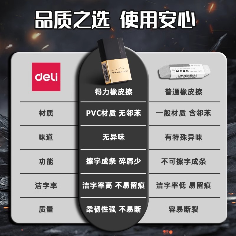 得力黑金真集屑橡皮擦小学生无屑专用干净不易留痕擦字成线美术生2B素描绘图绘画柔韧不易断像皮