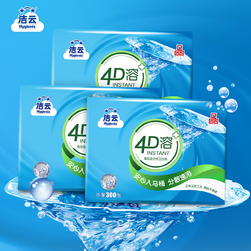 洁云4D溶方包卫生纸300张3包可溶性水溶刀切纸压花平板纸家用