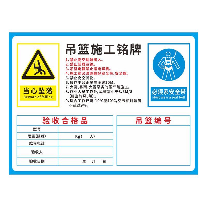 工地吊篮施工铭牌验收合格品禁止高空抛物当心坠落必须系安全带禁止翻越警示牌吊篮编号牌子反光铝牌定制