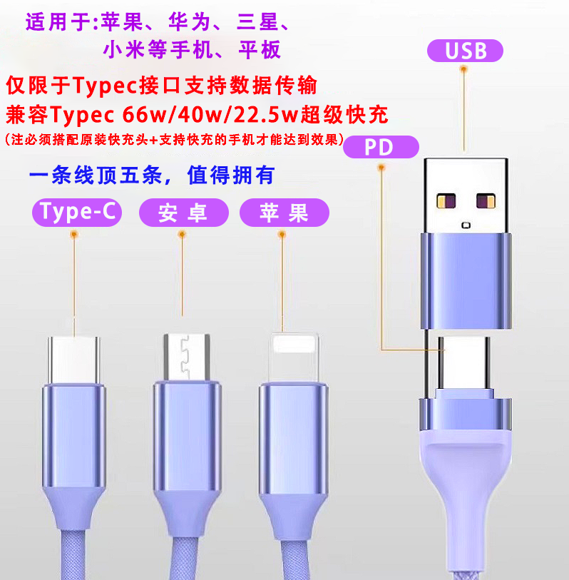 新款100w一拖三快充数据线车载三合一带灯超级闪充适用苹果iphone华为荣耀Type-C安卓vivo通用充电器多头