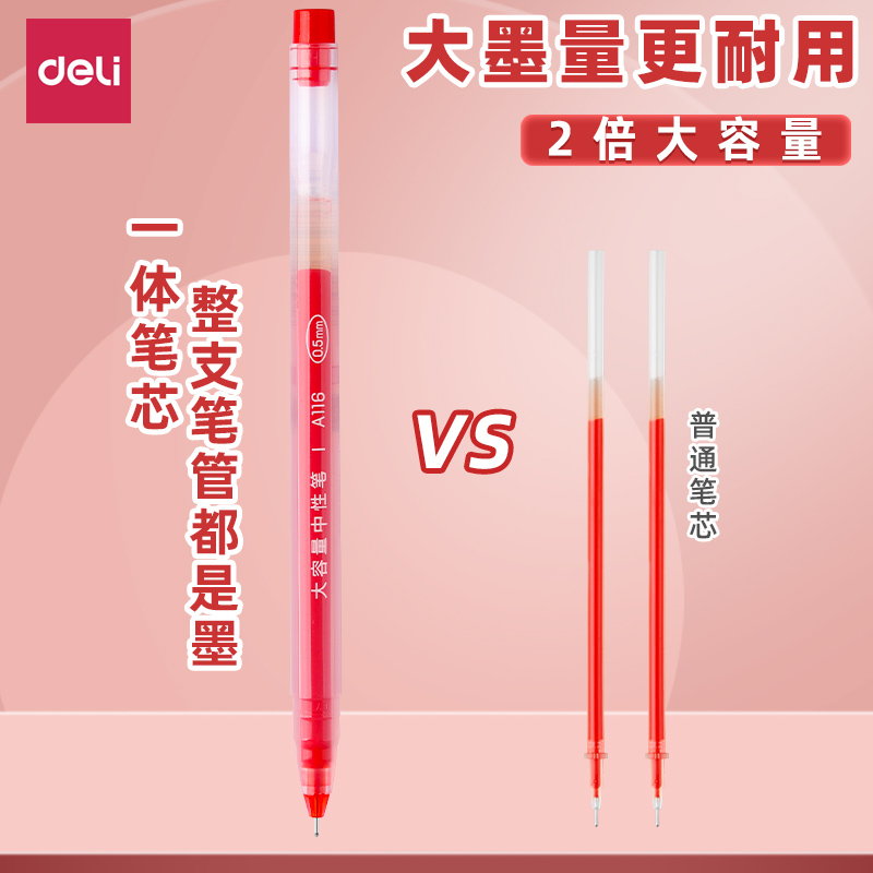 得力红笔大容量0.5mm教师批改专用红色中性笔水笔顺滑老师学生批改用高颜值速干初中生做笔记笔巨能写红笔