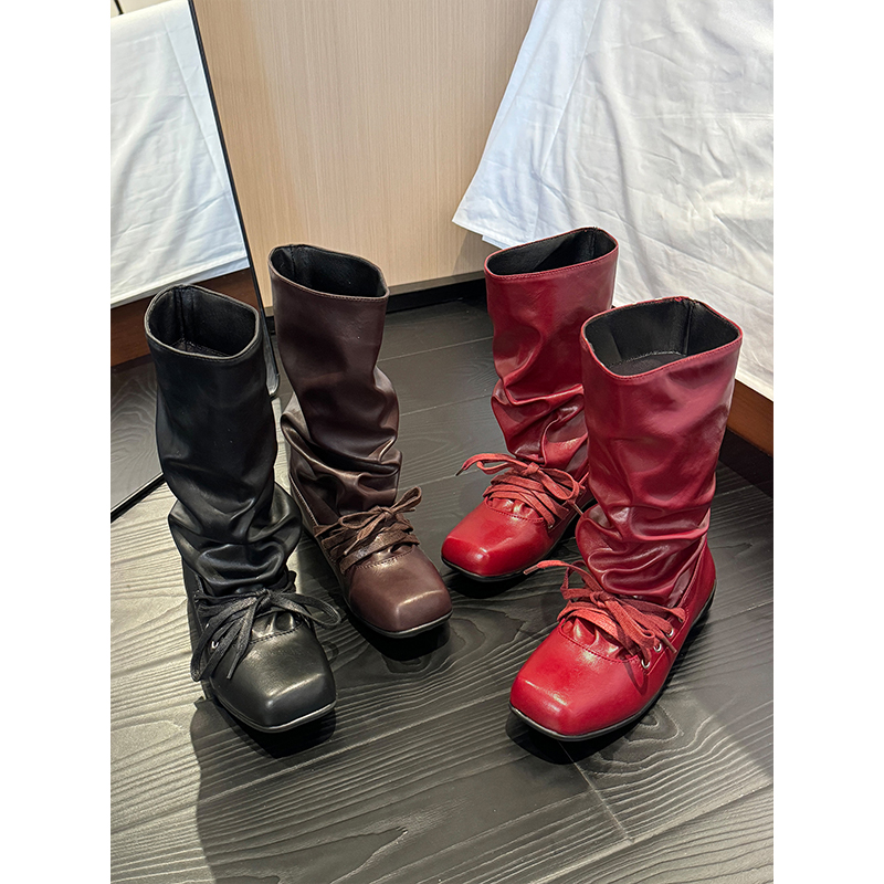 欧洲站靴子女款2025新款秋季百搭芭蕾风韩系方头红色短靴堆堆靴子