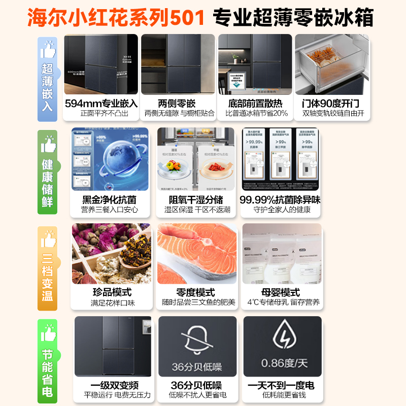 【补贴20%】海尔小红花501L十字对开四门超薄零嵌式大容量冰箱