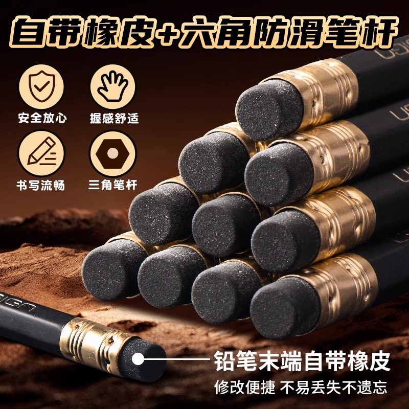 得力铅笔带橡皮头高端黑木高颜值幼儿园涂卡笔黑金黑木铅笔hb无毒一二年级2b练字考试专用高颜