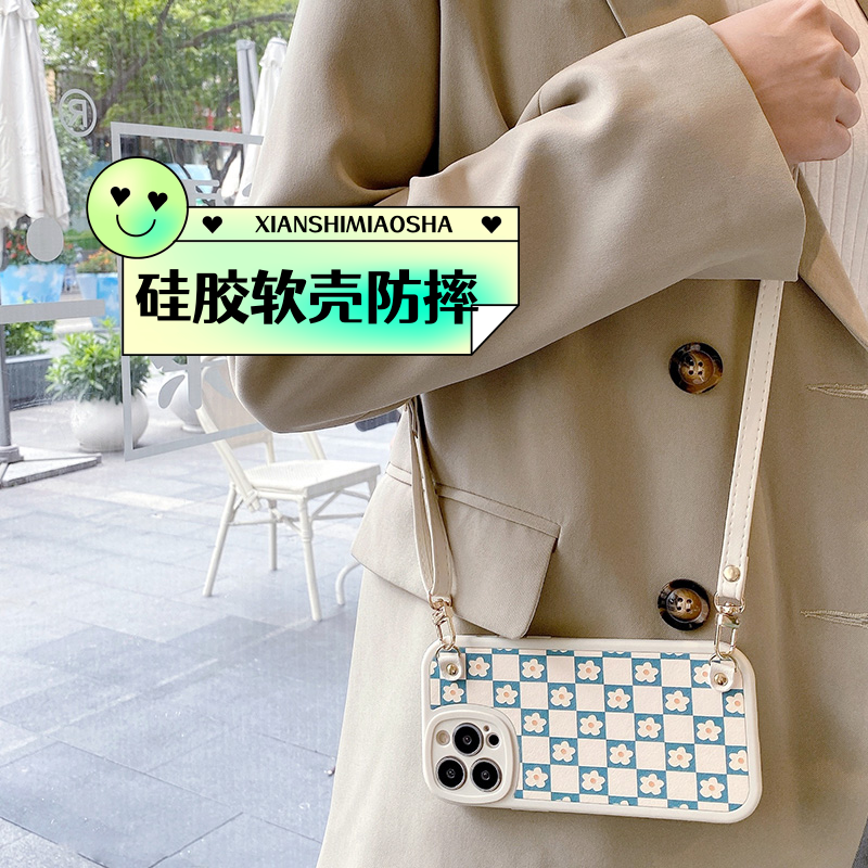 苹果14promax白格小花斜挎手机壳适用iphone13硅胶12防摔11软x壳xs立r体plus硅7胶8时p尚se定mini制6超薄网红