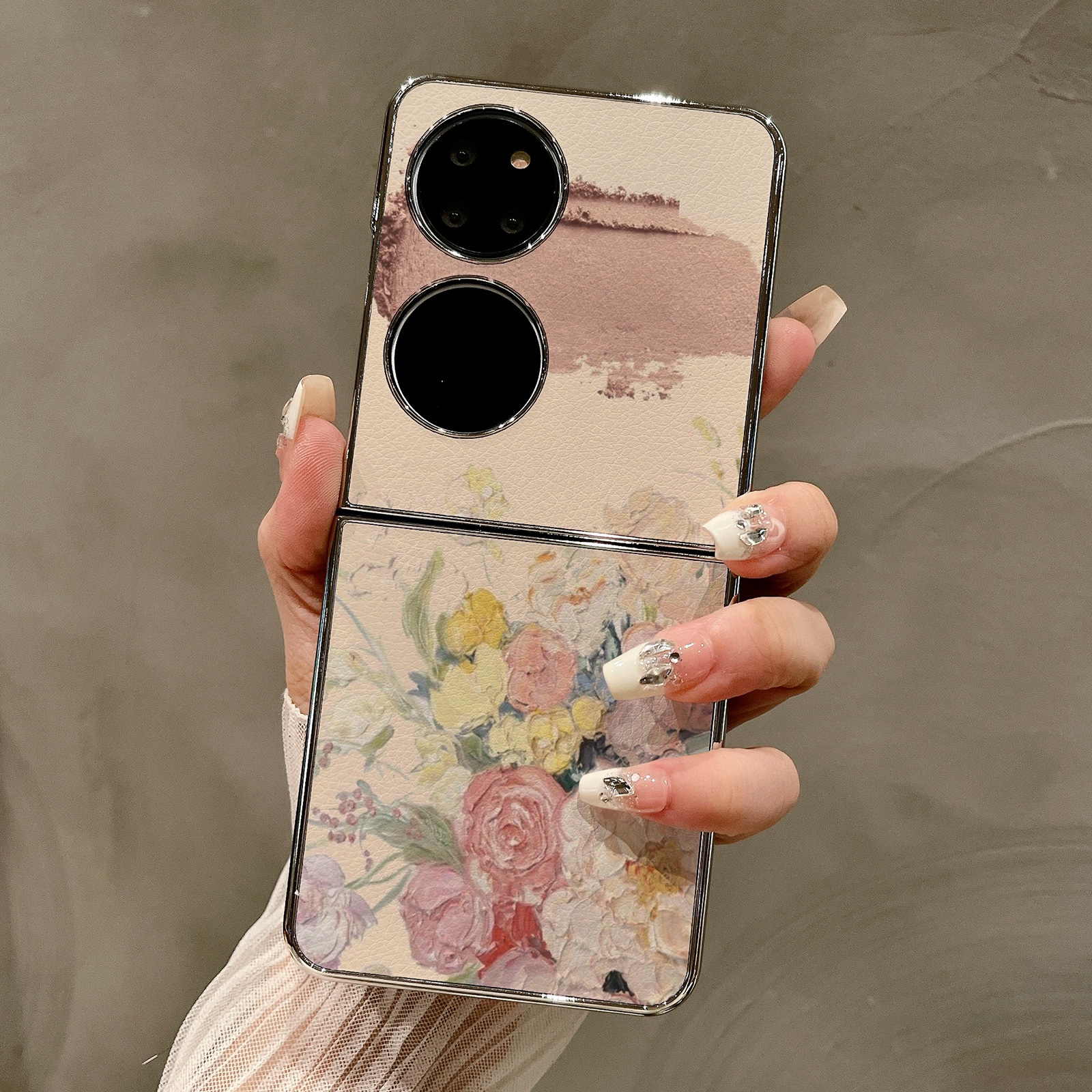 热瓜适用华为P50pocket手机壳Pocket2折叠屏保护套电镀浮雕感油画花朵银边新款pockets创意高档翻盖全包潮套