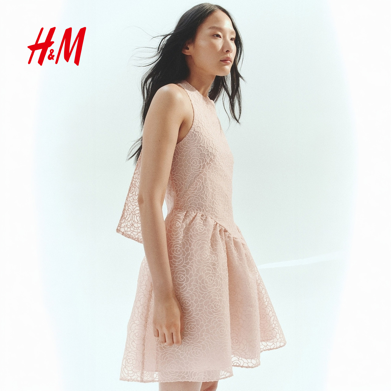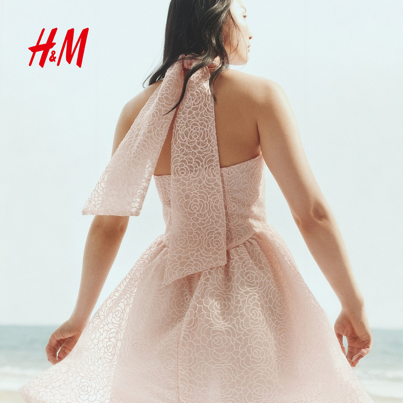 HM女装千金风连衣裙2025夏季新款法式刺绣无袖挂脖连身裙1282075