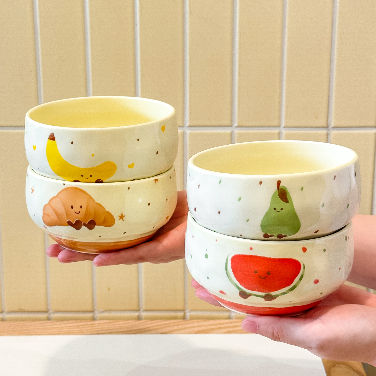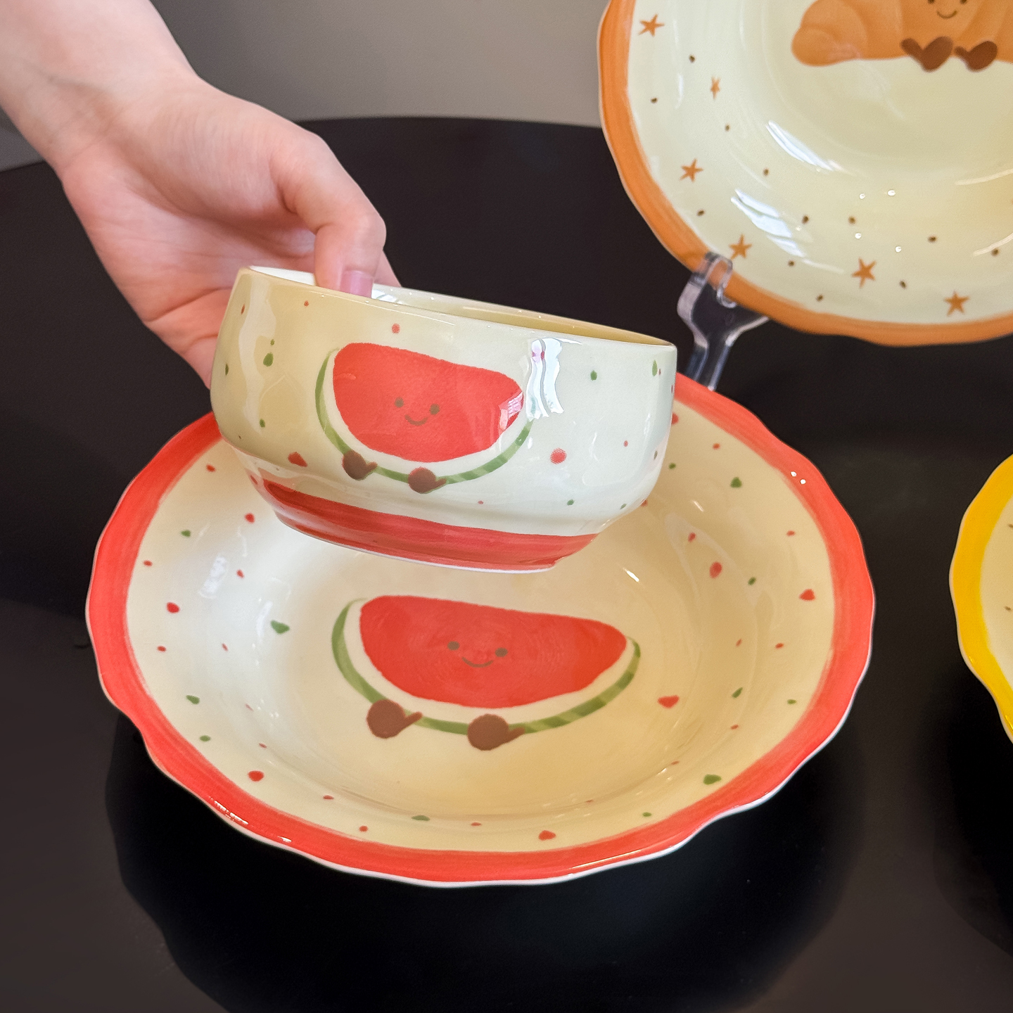 奶油风陶瓷碗家用卡通菜盘子可爱米饭碗汤碗釉下彩儿童餐具耐高温