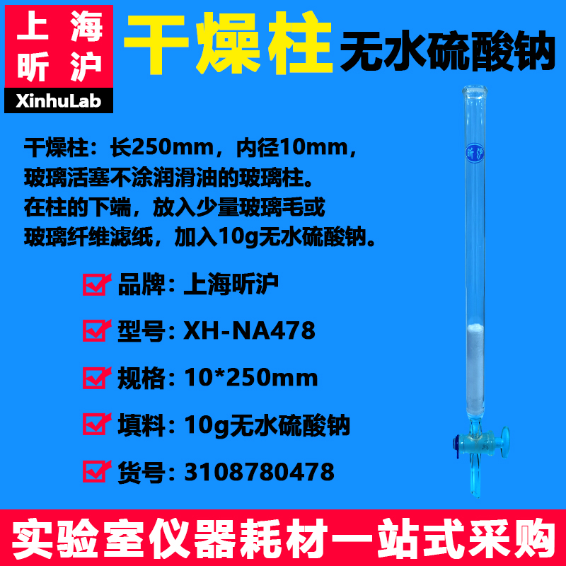 干燥柱:长250mm,内径20mm,玻璃活塞不涂润滑油的玻璃柱,加入10g无水硫酸钠,干燥柱:长250mm,内径10mm