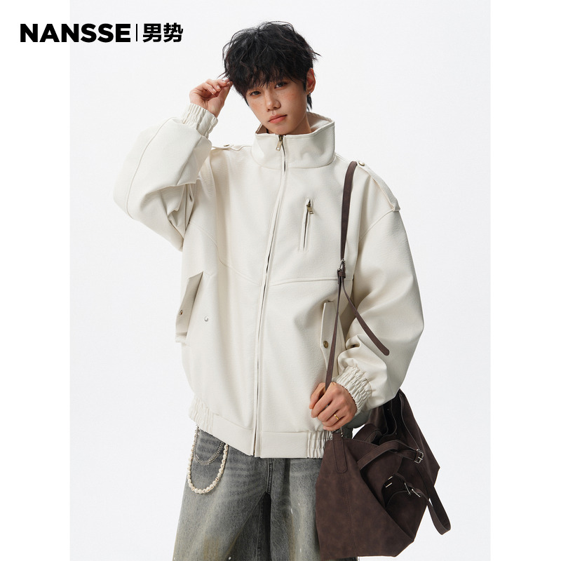 江南先生NewJNXS复古翻领双开拉链皮衣夹克男女休闲logo刺绣外套