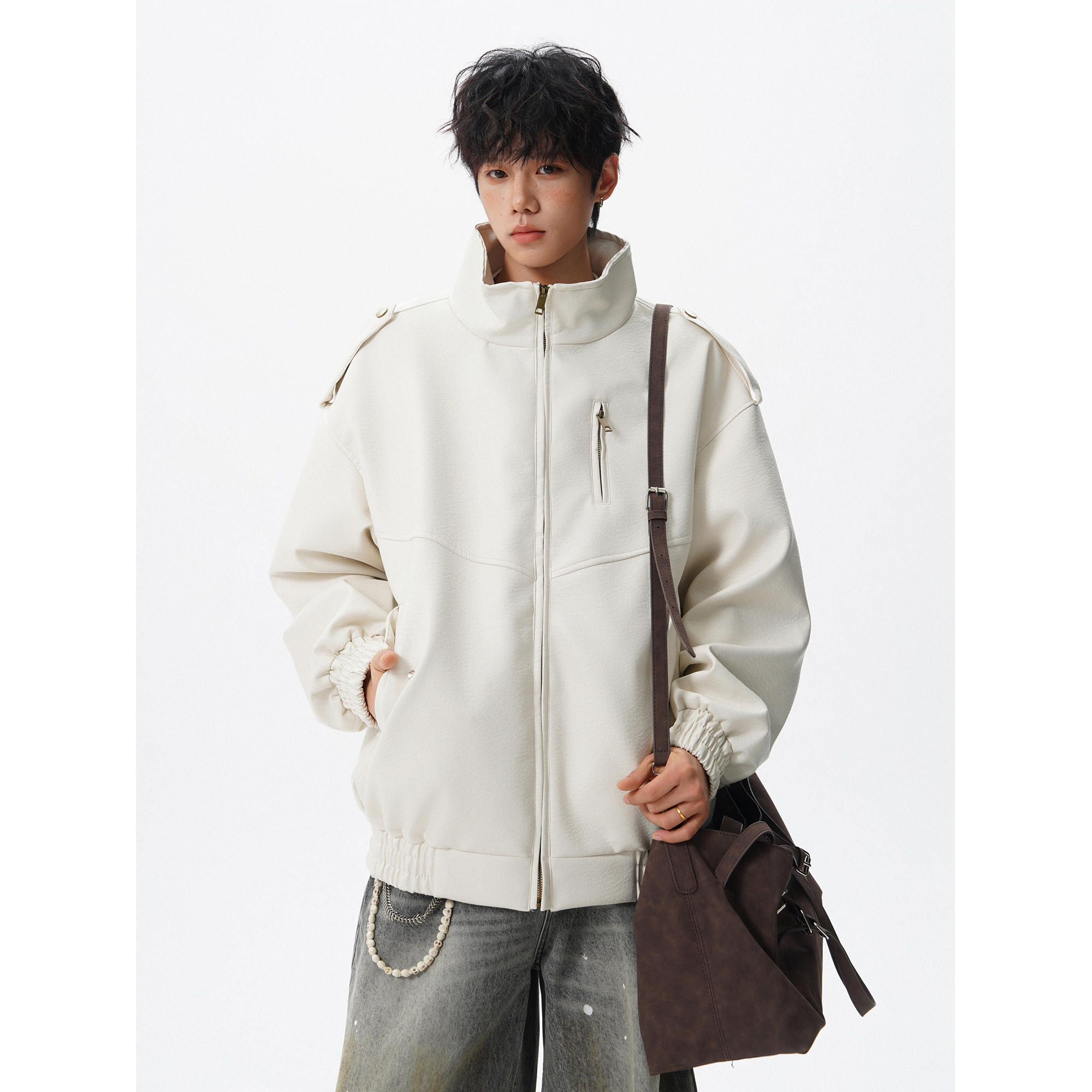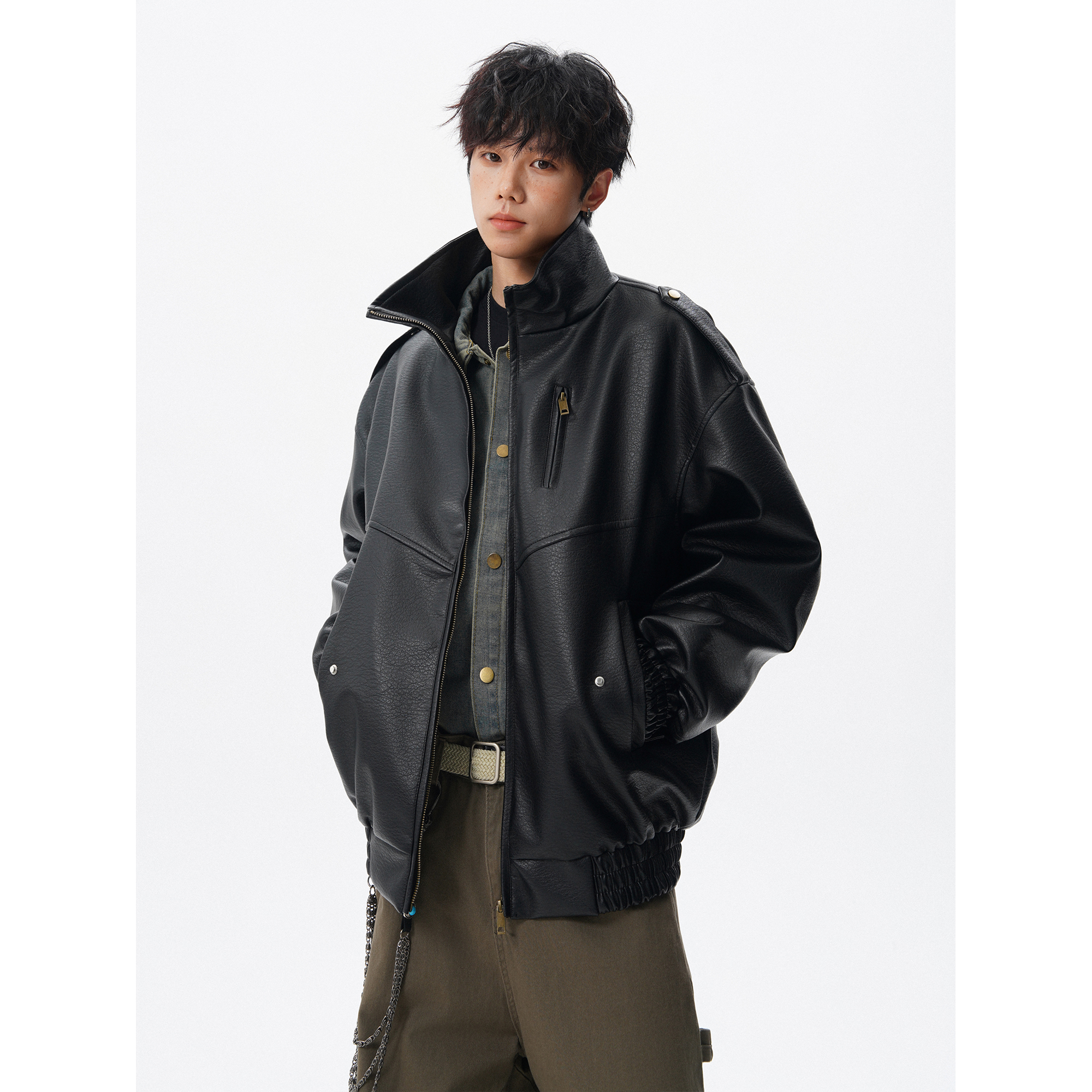 美式荔枝纹多拉链设计皮衣夹克男生秋季潮牌宽松休闲痞帅立领外套