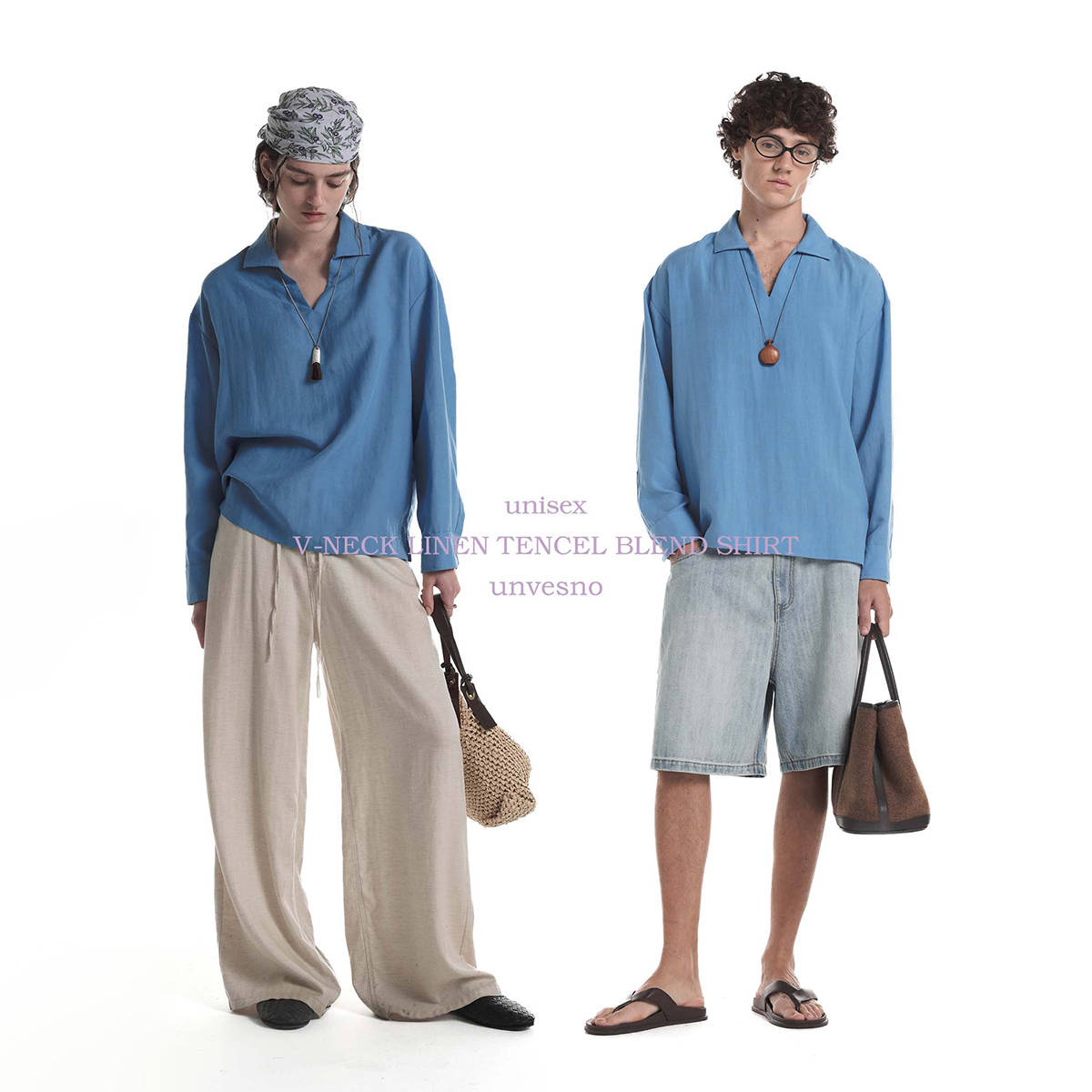 【小敏推荐】Unvesno(UN)亚麻莱赛尔极简V领慵感混纺套头衬衫秋季