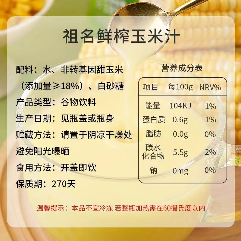 祖名鲜榨玉米汁饮品现榨果蔬汁鼓舞粗粮健康代早餐冲饮料1L*2冷冻