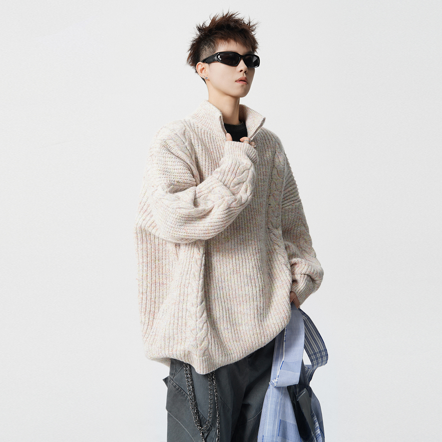 老钱风半高领麻花拉链毛衣男秋冬新款美式重磅宽松休闲保暖针织衫