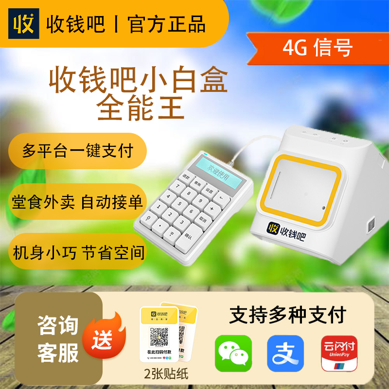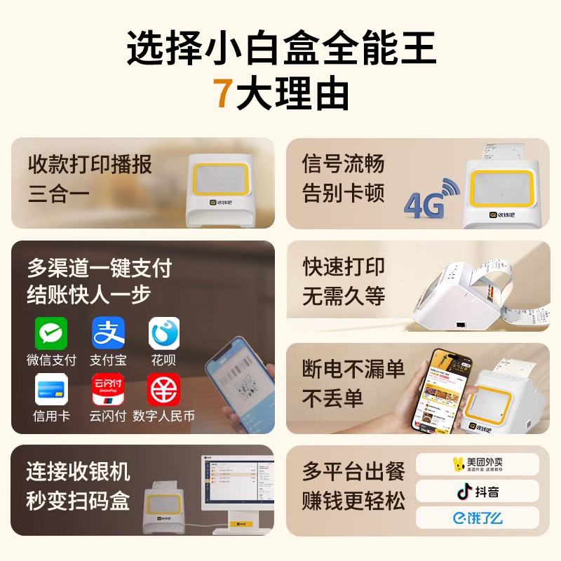收钱吧小白盒全能王收款出票播报三合一堂食外卖打印收款一体机