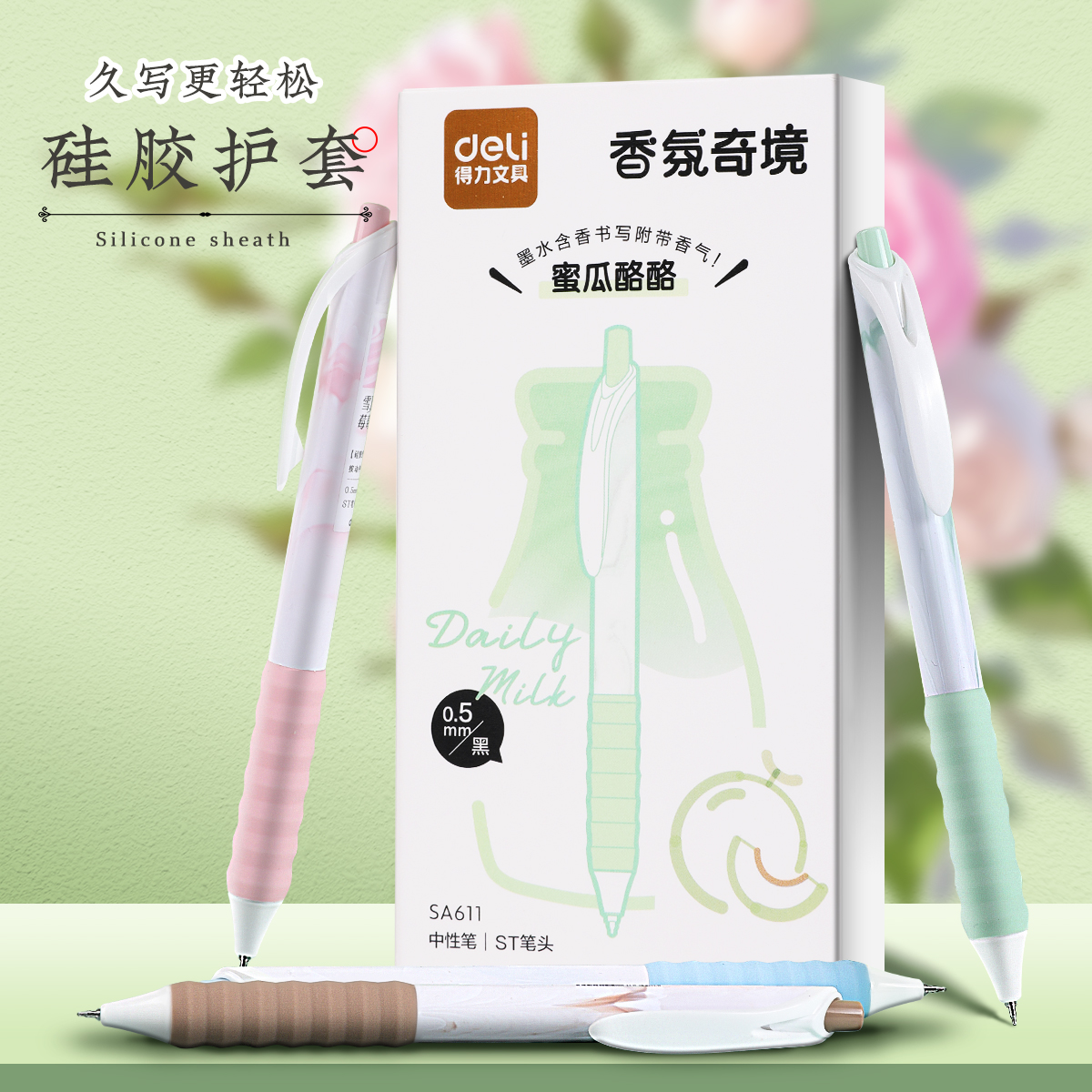 得力香味按动中性笔学生用st头刷题笔0.5黑色签字笔高颜值考试顺滑小清新护套书写中性笔女生好看的水笔