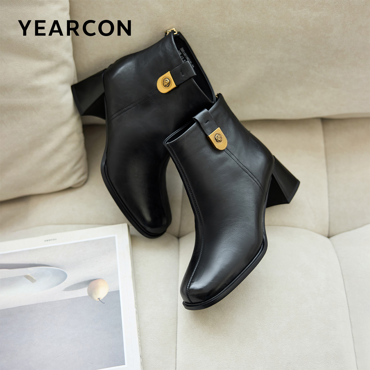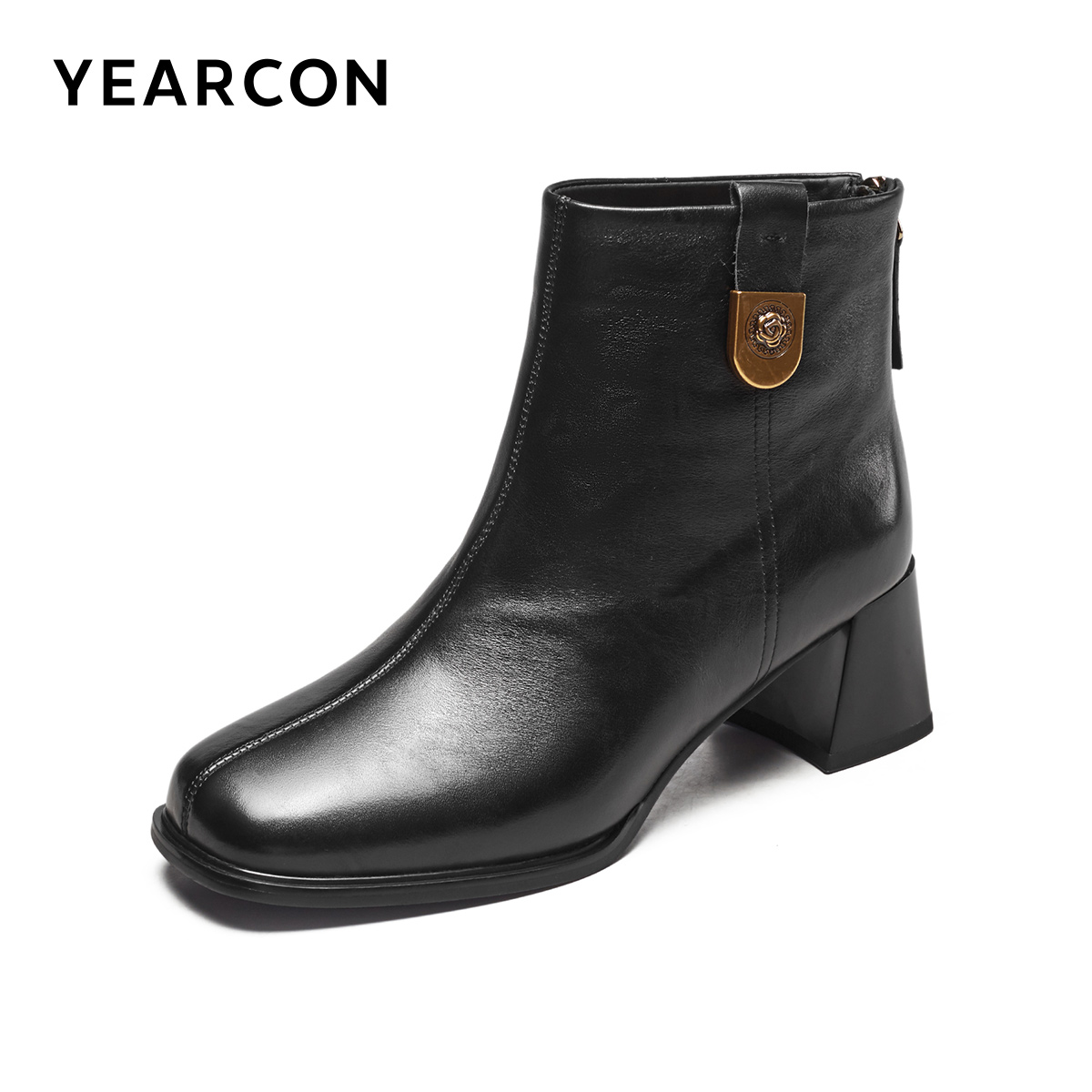 意尔康女鞋2025冬季真皮法式短靴粗跟气质显瘦配裙子单靴及踝靴