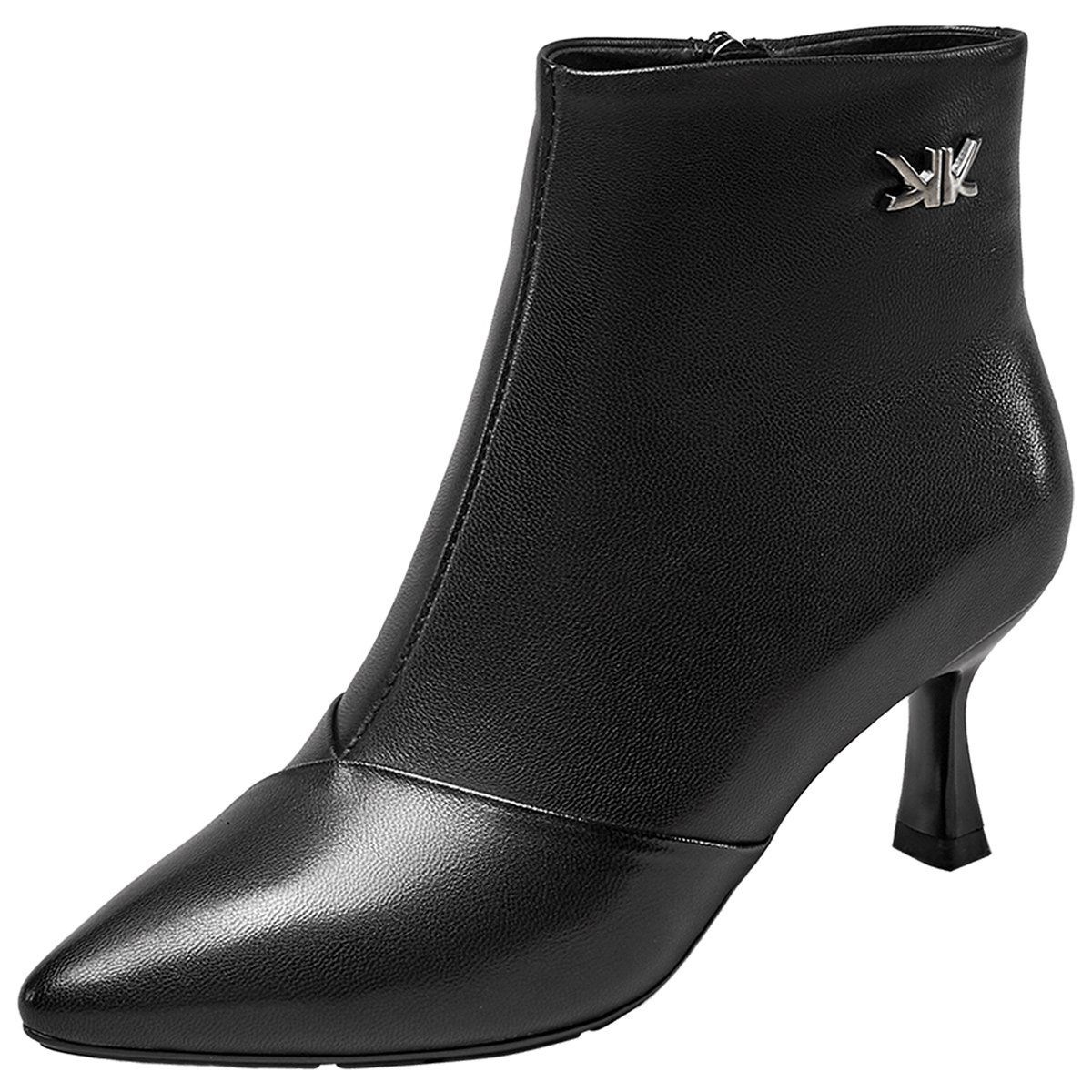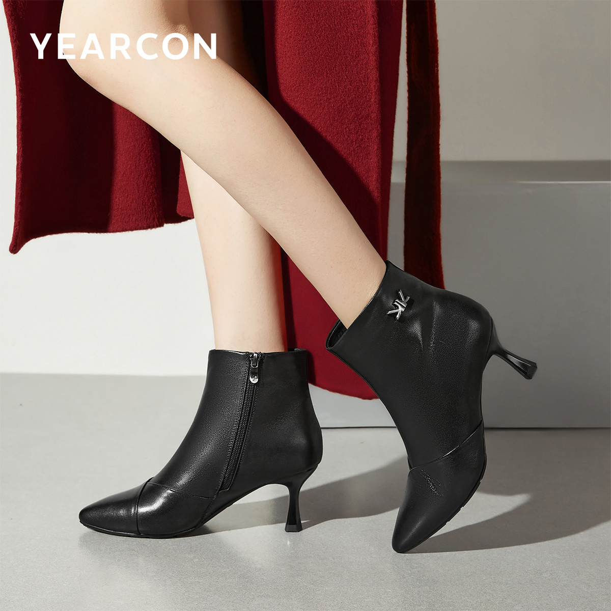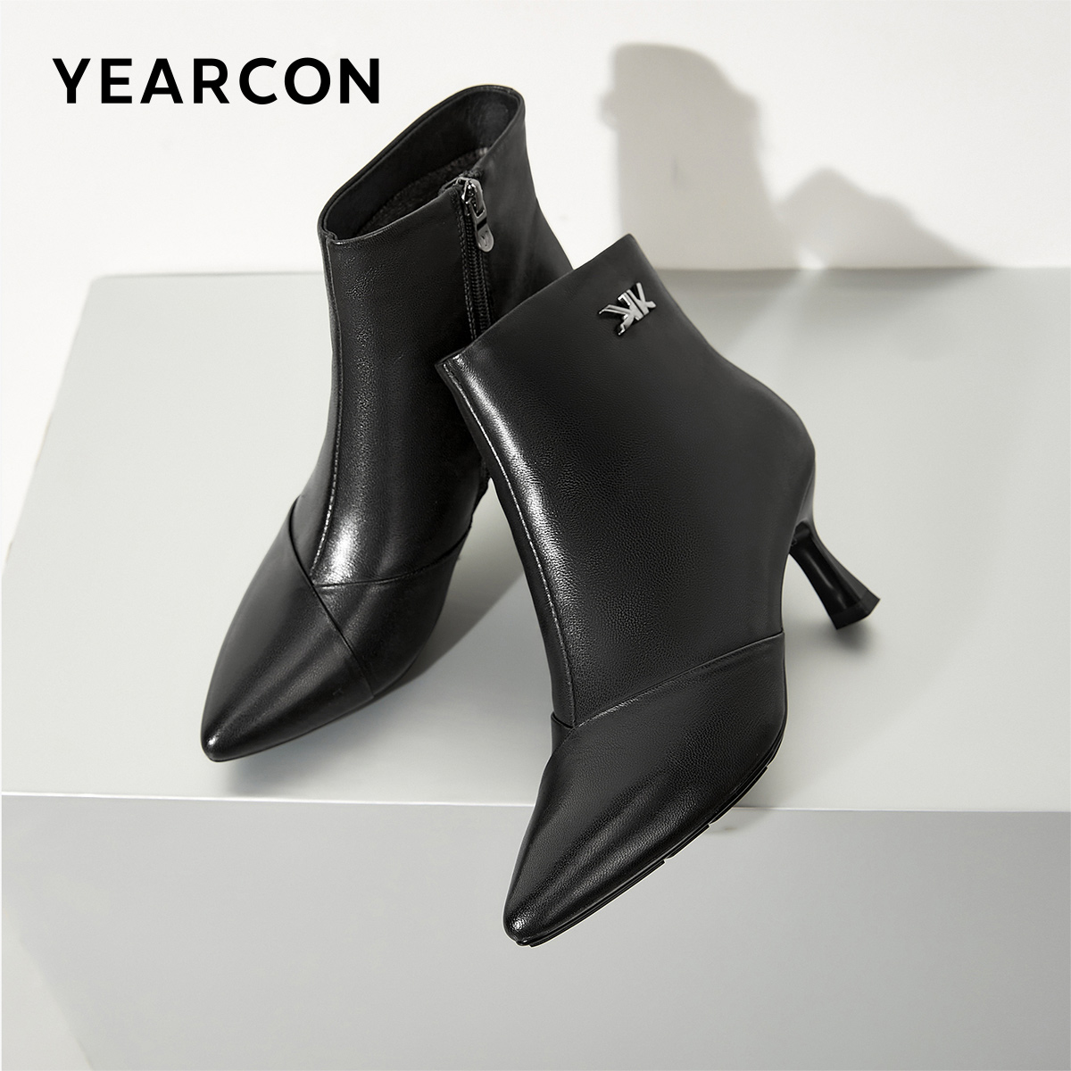 意尔康女鞋冬季真皮加绒短靴羊皮尖头细跟法式气质及踝靴女士皮鞋