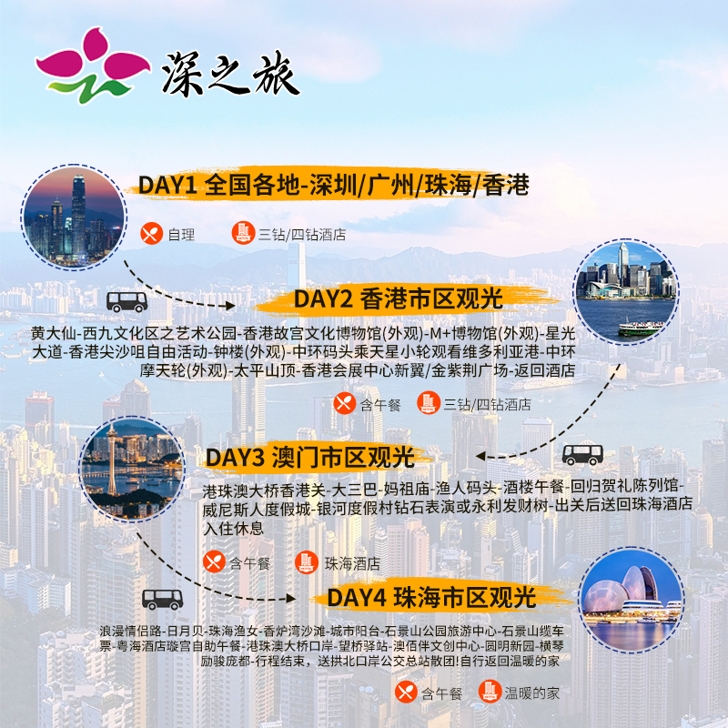 港澳旅游团专车接机4天3晚跟团游香港旅游纯玩澳门旅游珠海一日游