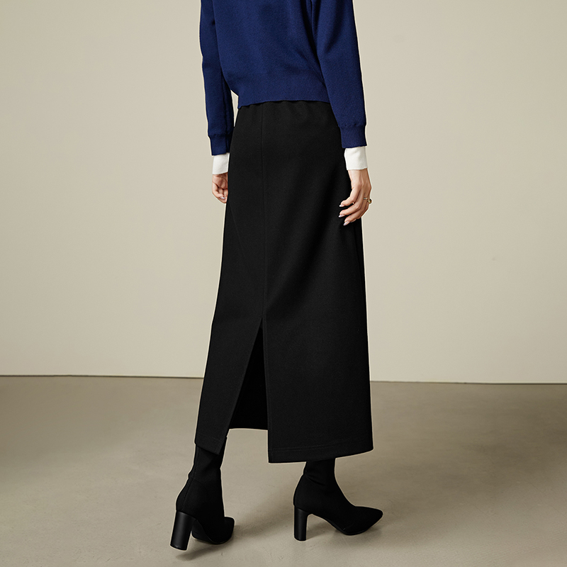 晚白2025年冬新款时尚简约半裙全松紧厚毛呢后开叉直筒长半身裙