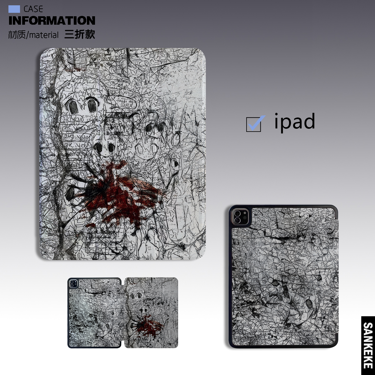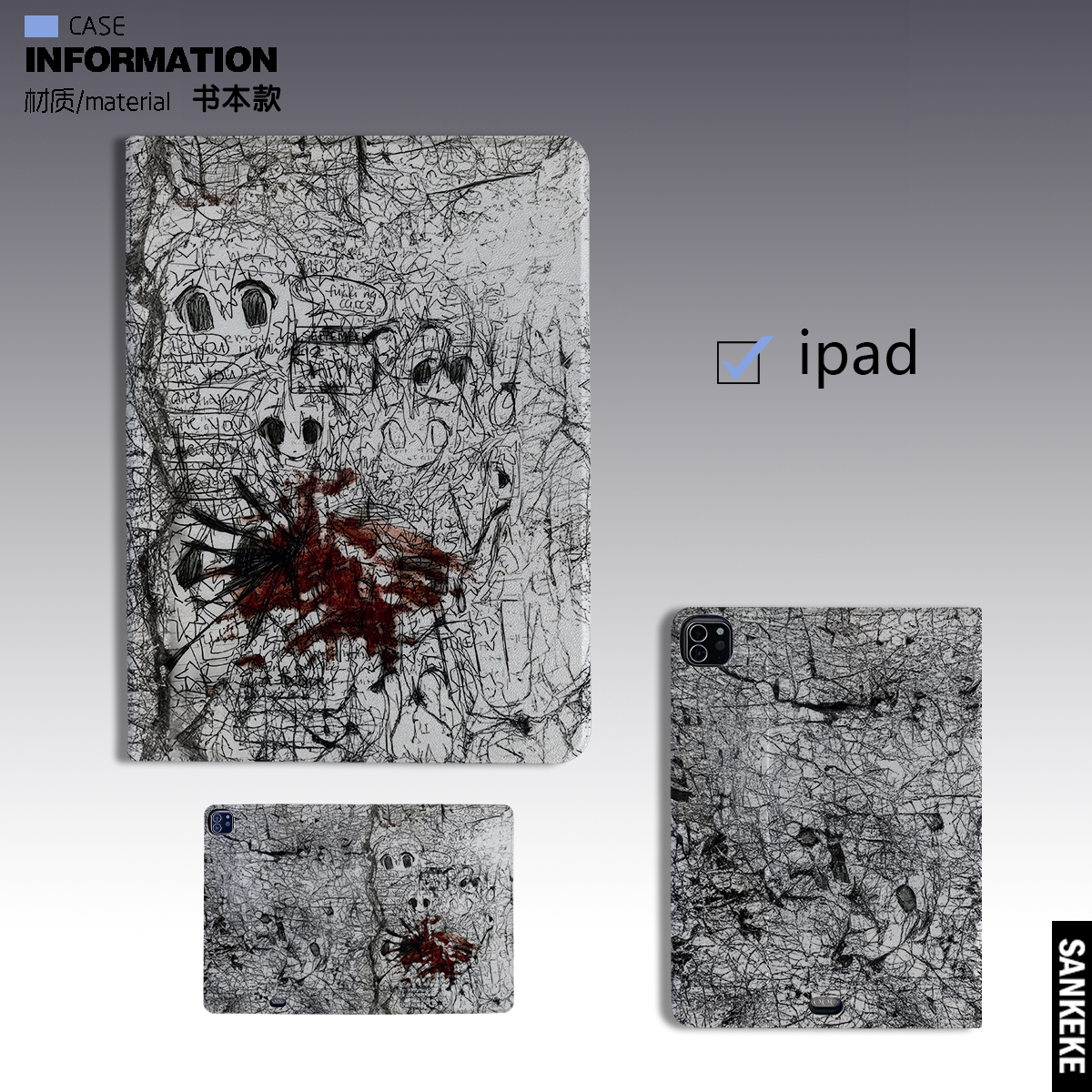 三壳壳原创小众血色简笔画古董白色适用于苹果2023IPADpro/air/5/4/3/旋转亚克力三折书本款带笔槽平板保护套