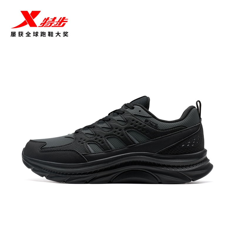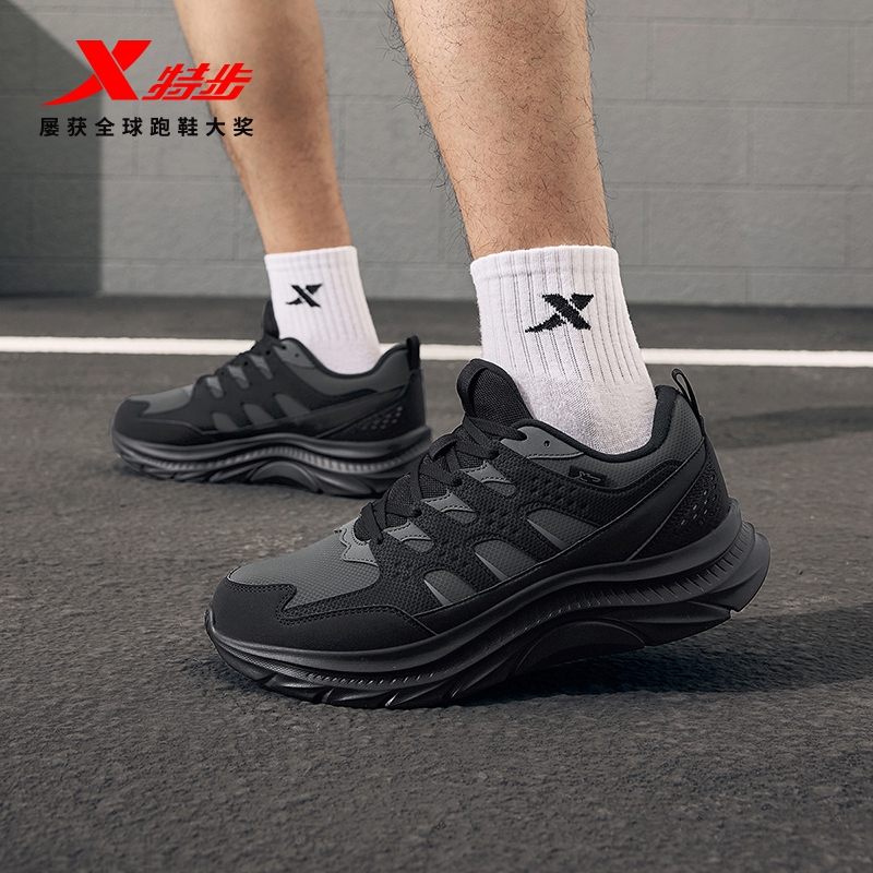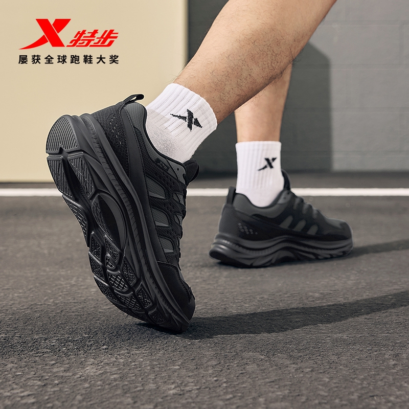 特步跑步鞋男鞋秋季新款黑色运动鞋皮面防泼水爸爸减震网面休闲鞋