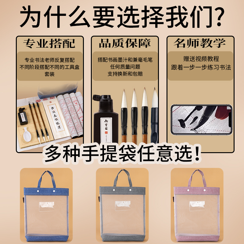 毛笔初学书法套装初学者入门专用狼毫兼毫儿童小学生水写布笔墨纸砚练字全套成人专业文房四宝收纳工具手提袋