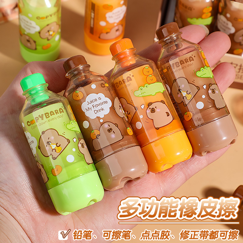网红卡皮巴拉饮料瓶橡皮擦多功能橡皮仿真果冻汽水瓶橡皮学生热可擦笔点点胶多用途橡皮高颜值擦得干净少屑