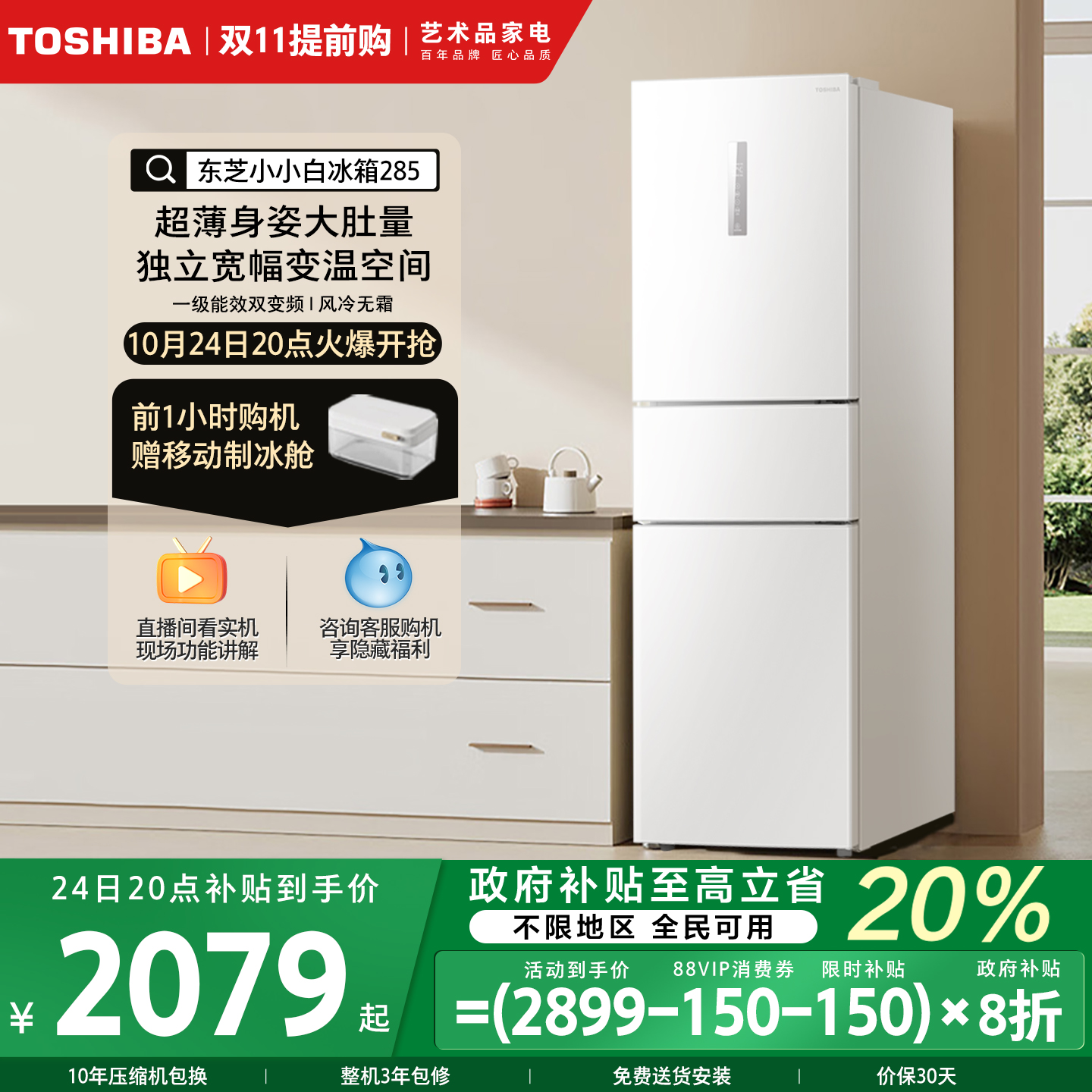 东芝小小白285三门小户型一级能效风冷无霜变频家用冰箱以旧换新