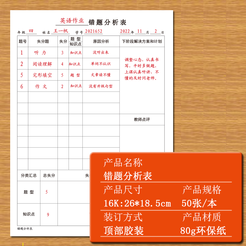 错题分析表适合小学生初中生高中生数学英语物理等各学科错题失分题原因分析下阶段解决方案和计划错题分析表