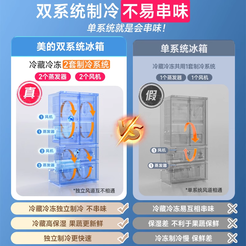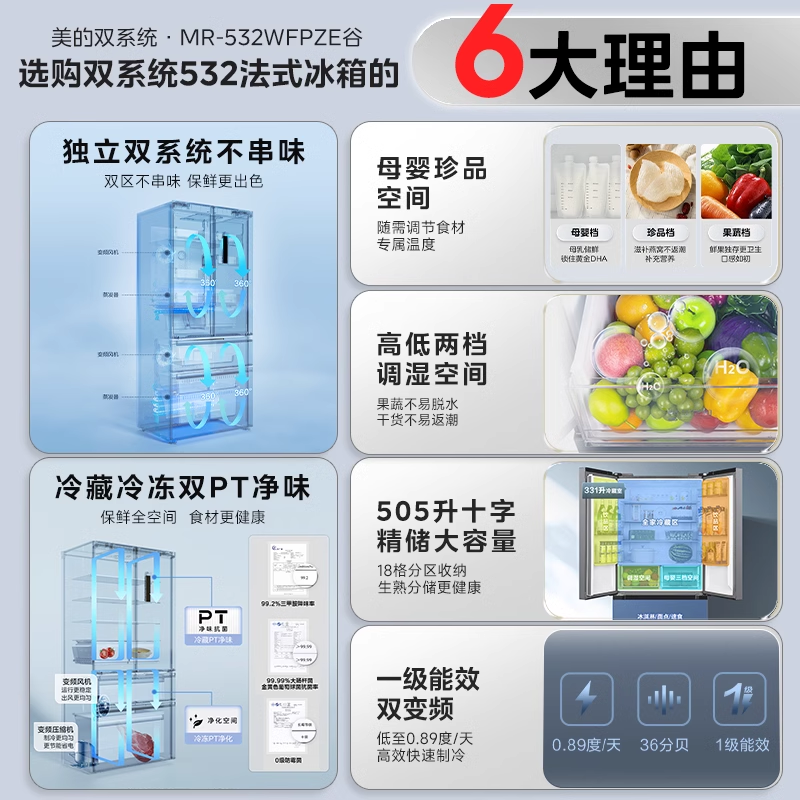 美的508法式双系统多门净味四门双循环无霜一级大容量家用冰箱