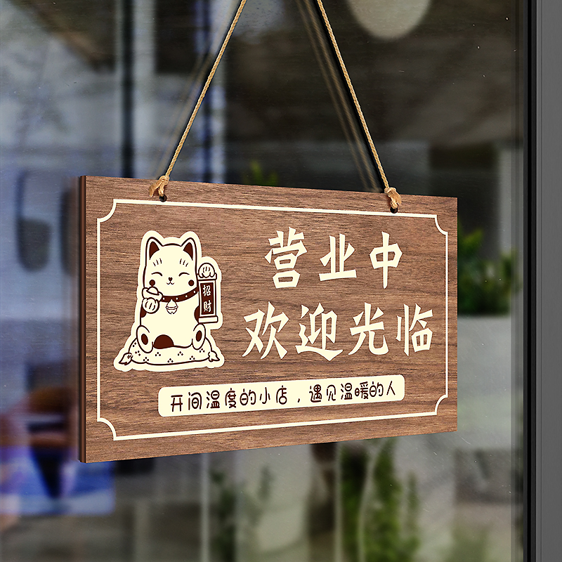 正在营业中挂牌欢迎光临店门口装饰吸引人门店告示店铺正常休息中玻璃门临时有事外出提示牌电话号码温馨标识